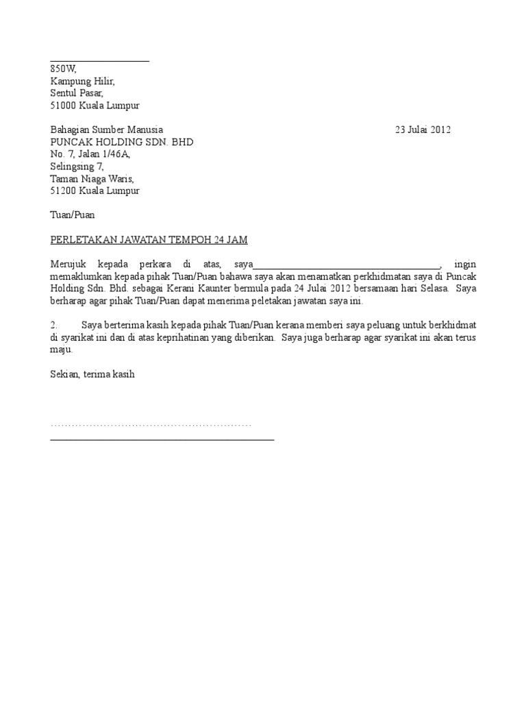 . Contoh Surat Berhenti Kerja 24 Jam Pdf Modify 3. TuanPuan SURAT PERLETAKAN JAWATAN Dengan segala hormatnya perkara di atas adalah dirujuk. Bil perkara muka surat pindaan gred jawatan gaji skim perkhidmatan.